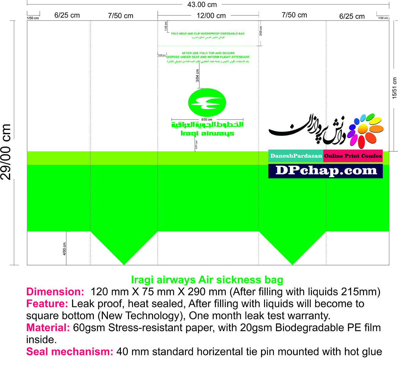 مشخصات فنی پاکت تهوع هواپیمایی پرواز های خارجی (تصویر بزرگتر) به شرح تصویر زیر می باشد.